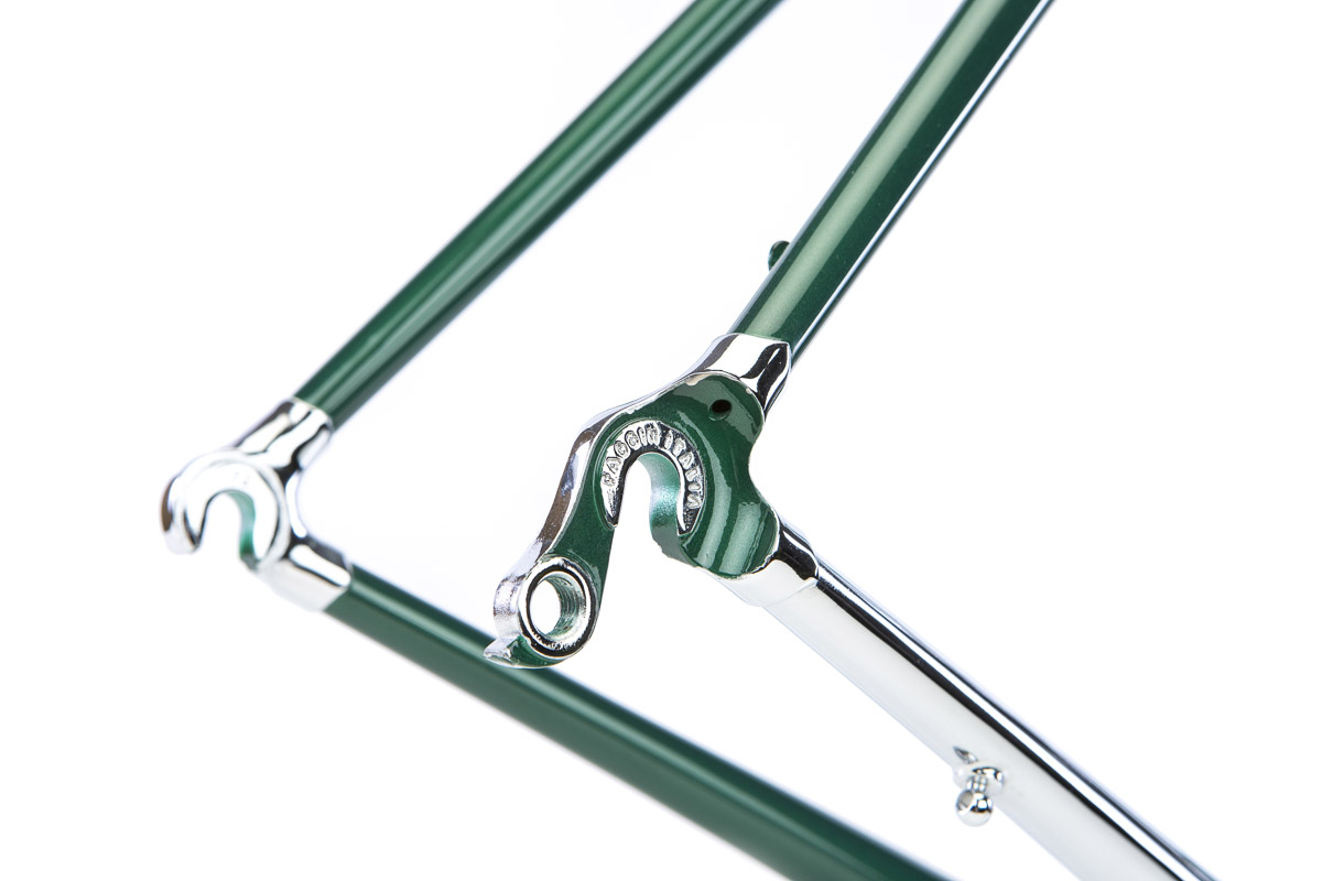 A handmade road frameset built with Columbus Spirit Oversize and cast lugs that recall the golden era of cycling. The 1”-1/8 headtube brings it up to date with added strength and durability.